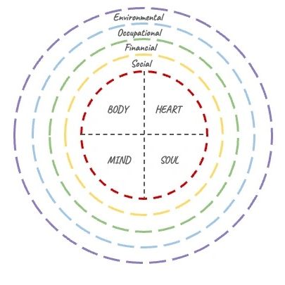 Any reference to wellness will produce 8 key areas. To think FluildlyFit is to recognize that our Core Four - body, heart, mind, and soul - are the foundation to self-actualization. Social, financial, occupational, and environmental wellness are the external influences that contribute to overall wellbeing.